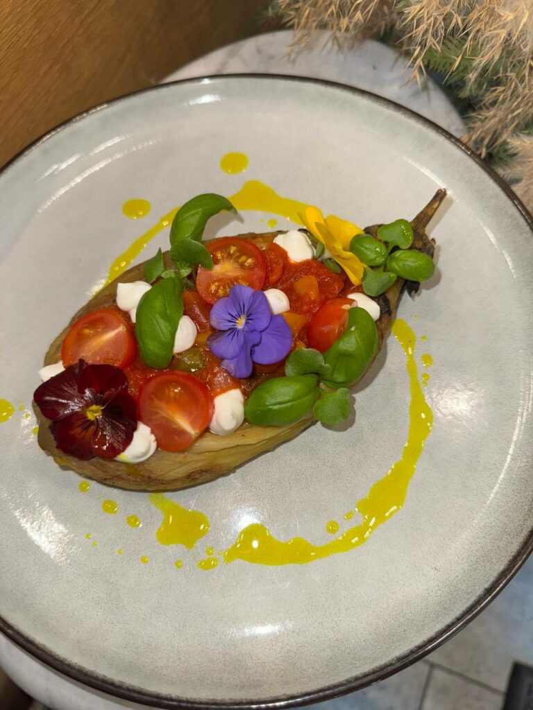 (Баклажаны, розовые помидоры, красный лук, кунжут, фирменный соус) 200гр