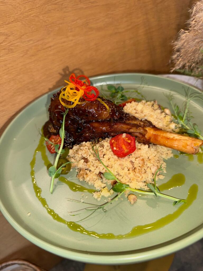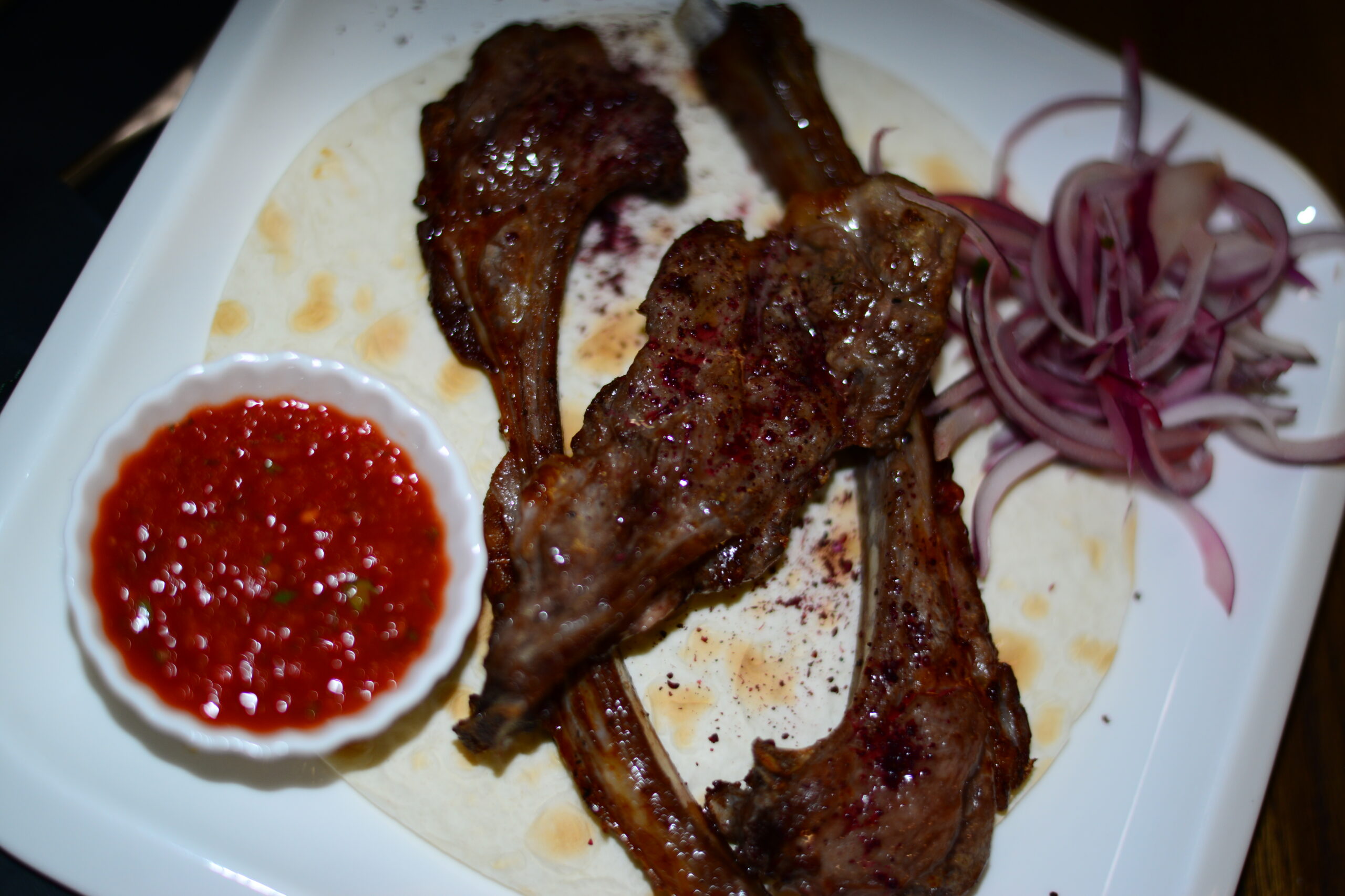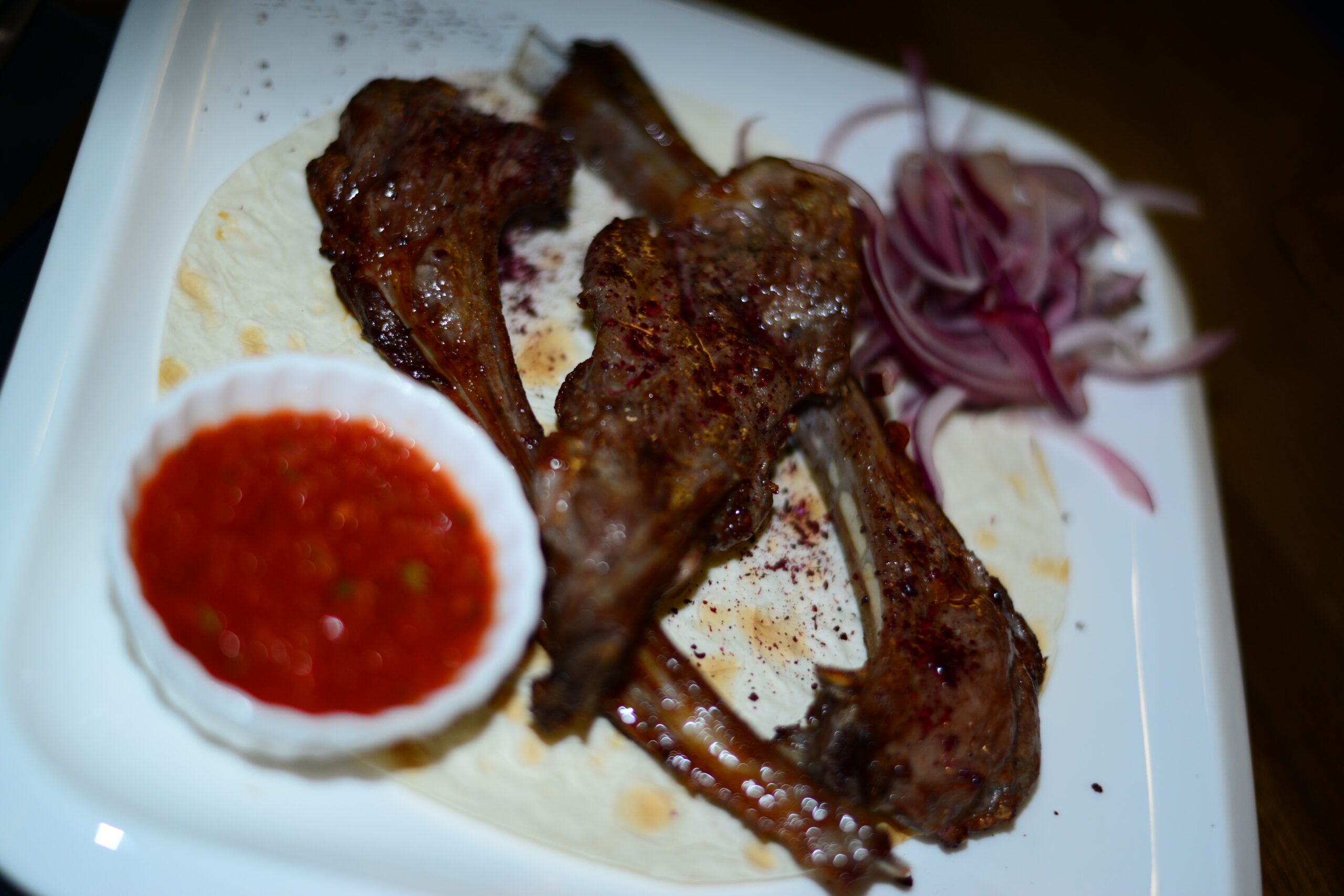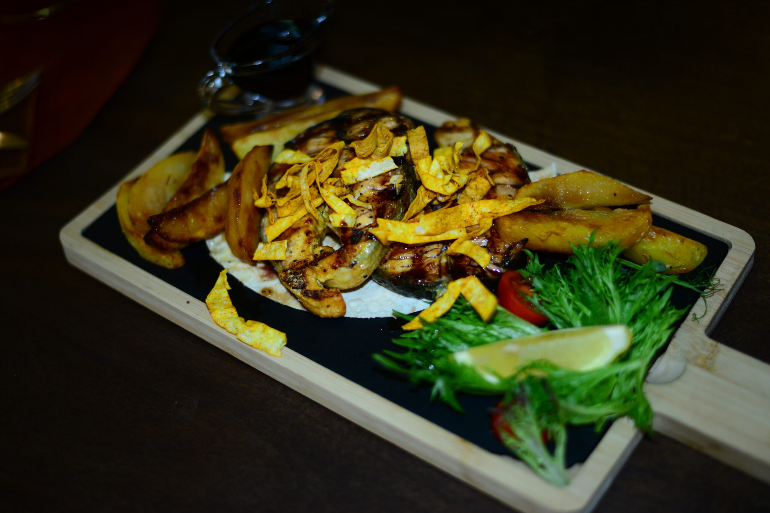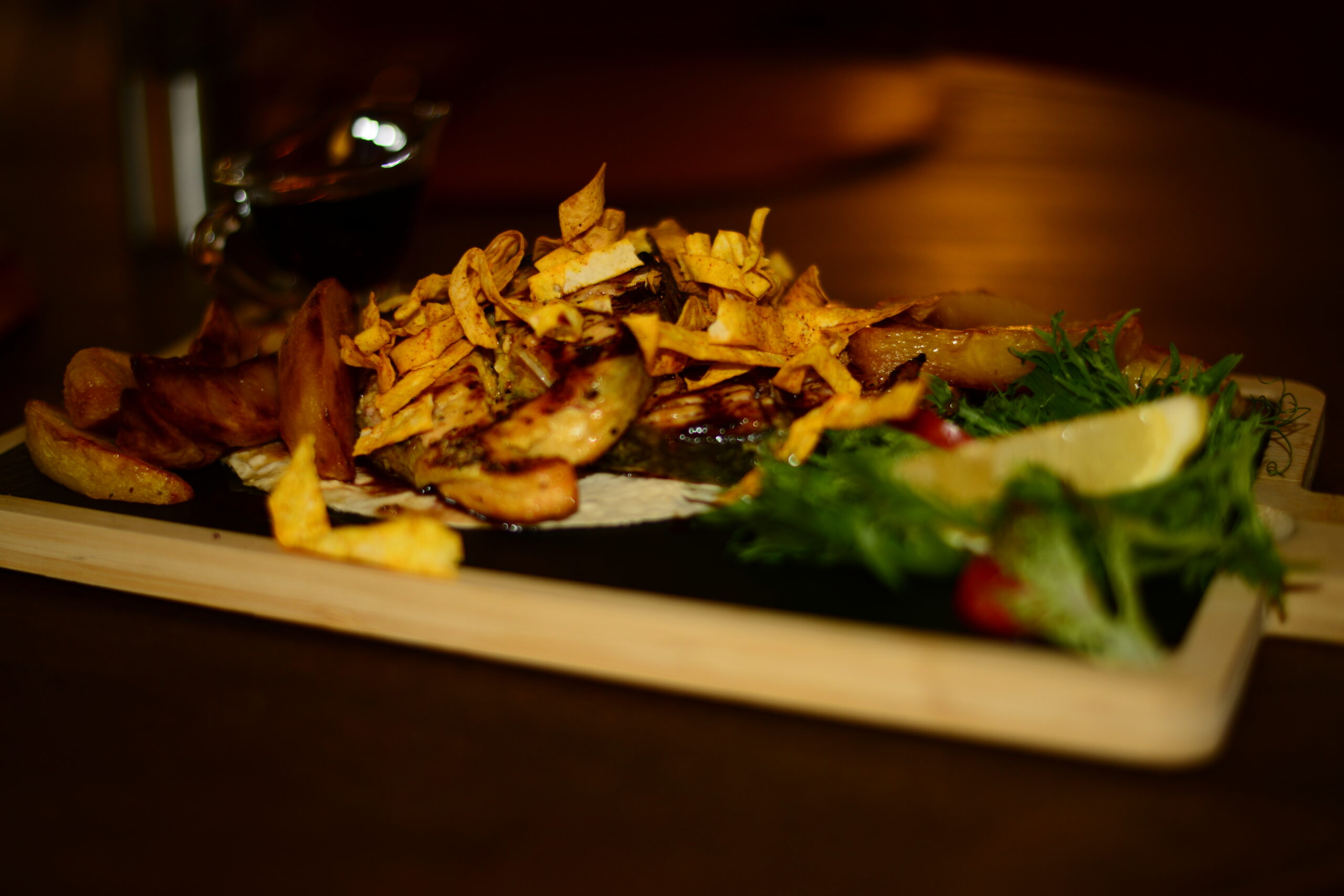 (мясо ягнёнка, запечённый картофель, репчатый лук, помидоры черри, маринованный лук, кинза) 300г