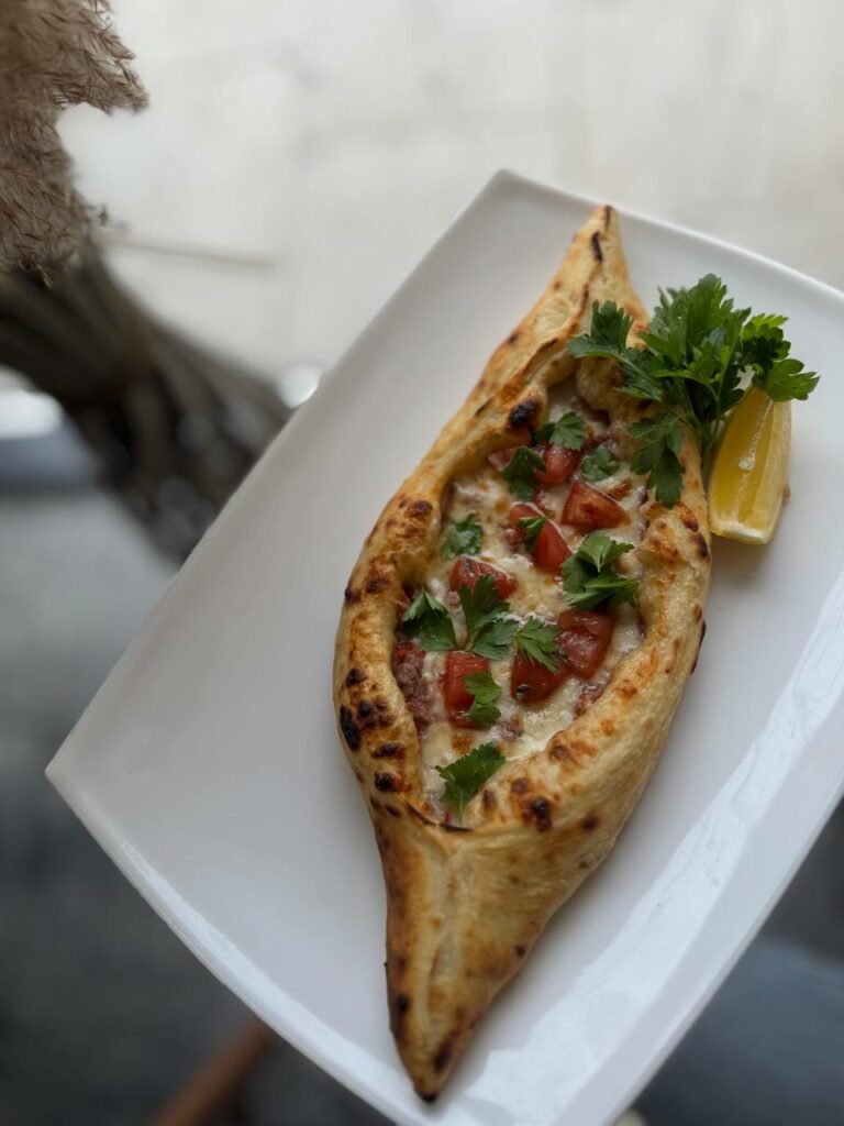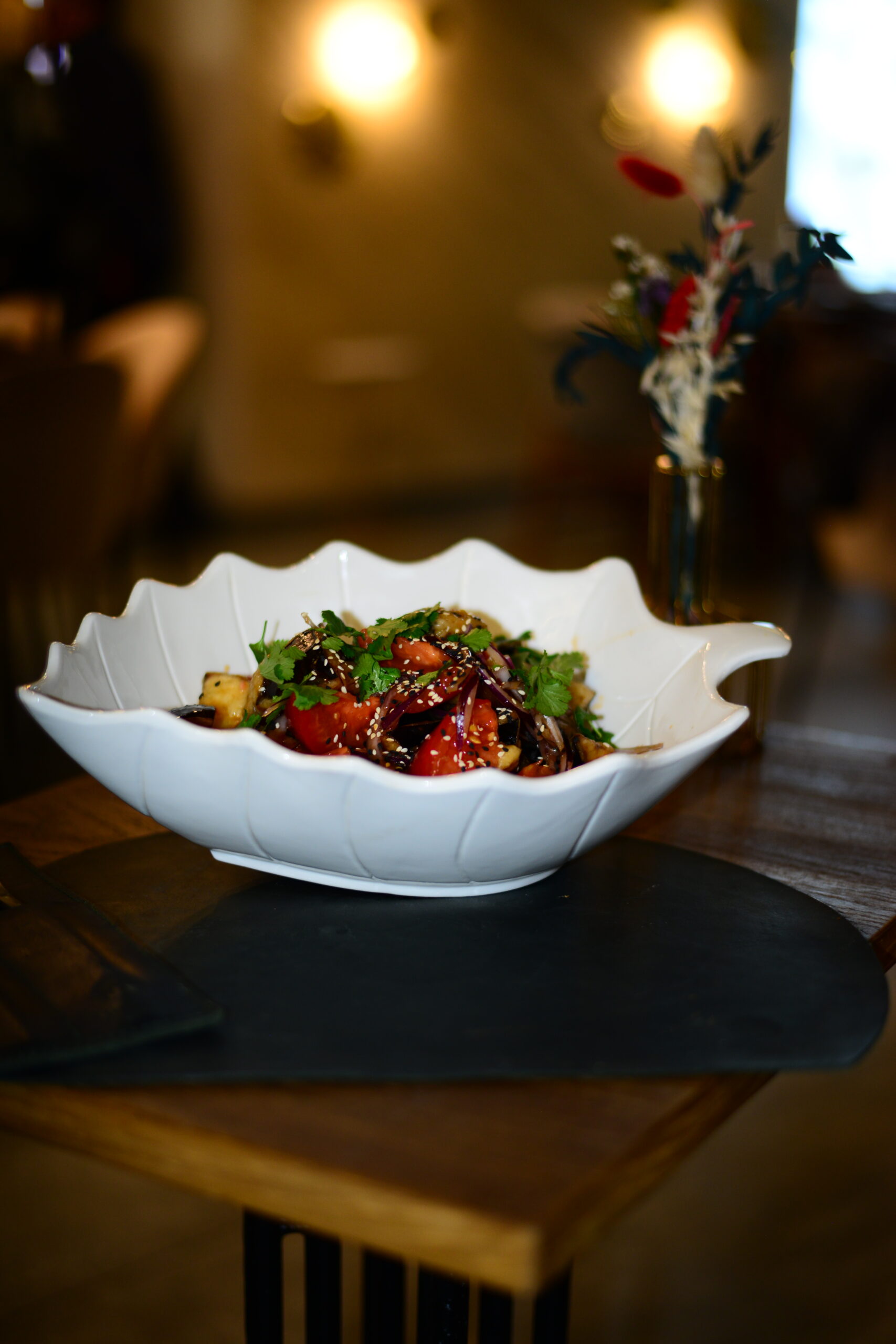 (розовый помидор, красный лук, страчателла, фирменный гранатовый соус, кинза) 350г