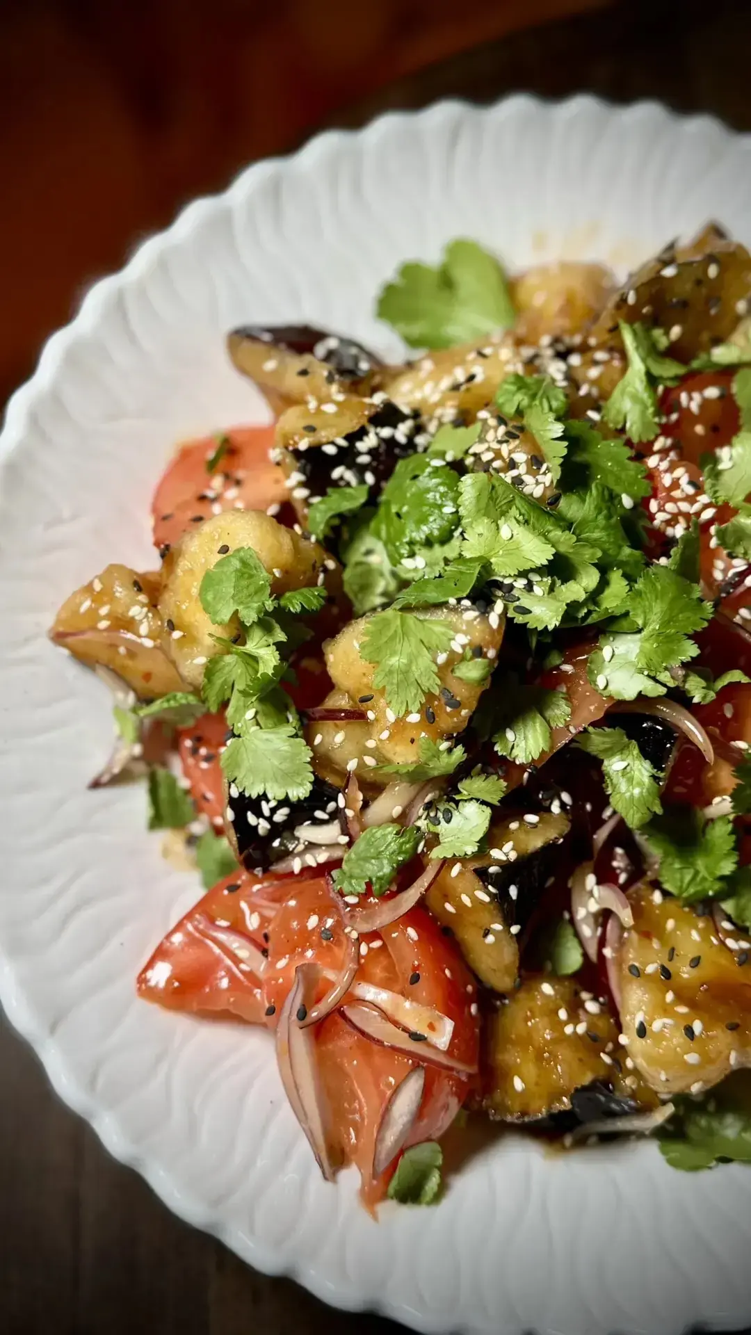 бонкассе из помидоров, сыр страчателла,кинза,кунжут,соус токио
